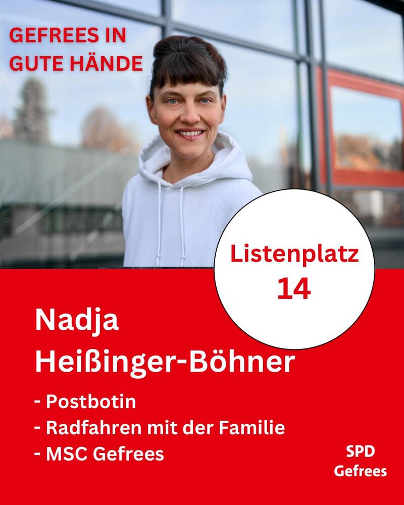 Nadja ist Postbotin, gerne mit dem Fahrrad unterwegs und aktiv im MSC Gefrees. Nadja kennt die Menschen und Wege in unserer Stadt und weiß, was den Alltag vor Ort ausmacht.