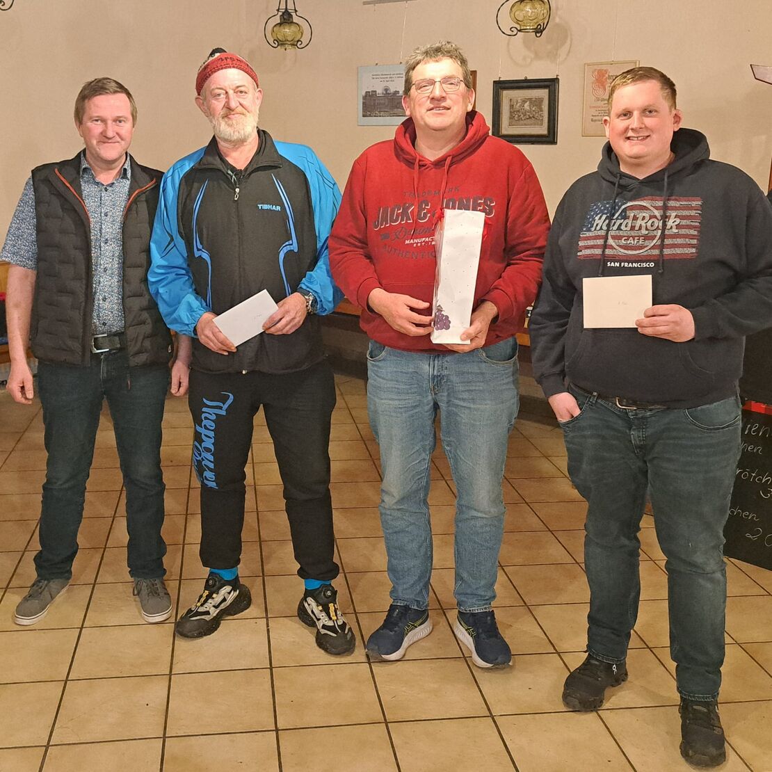 Bürgermeisterkandidat A. Heißinger mit den drei Bestplatzierten des Schafkopfrennens